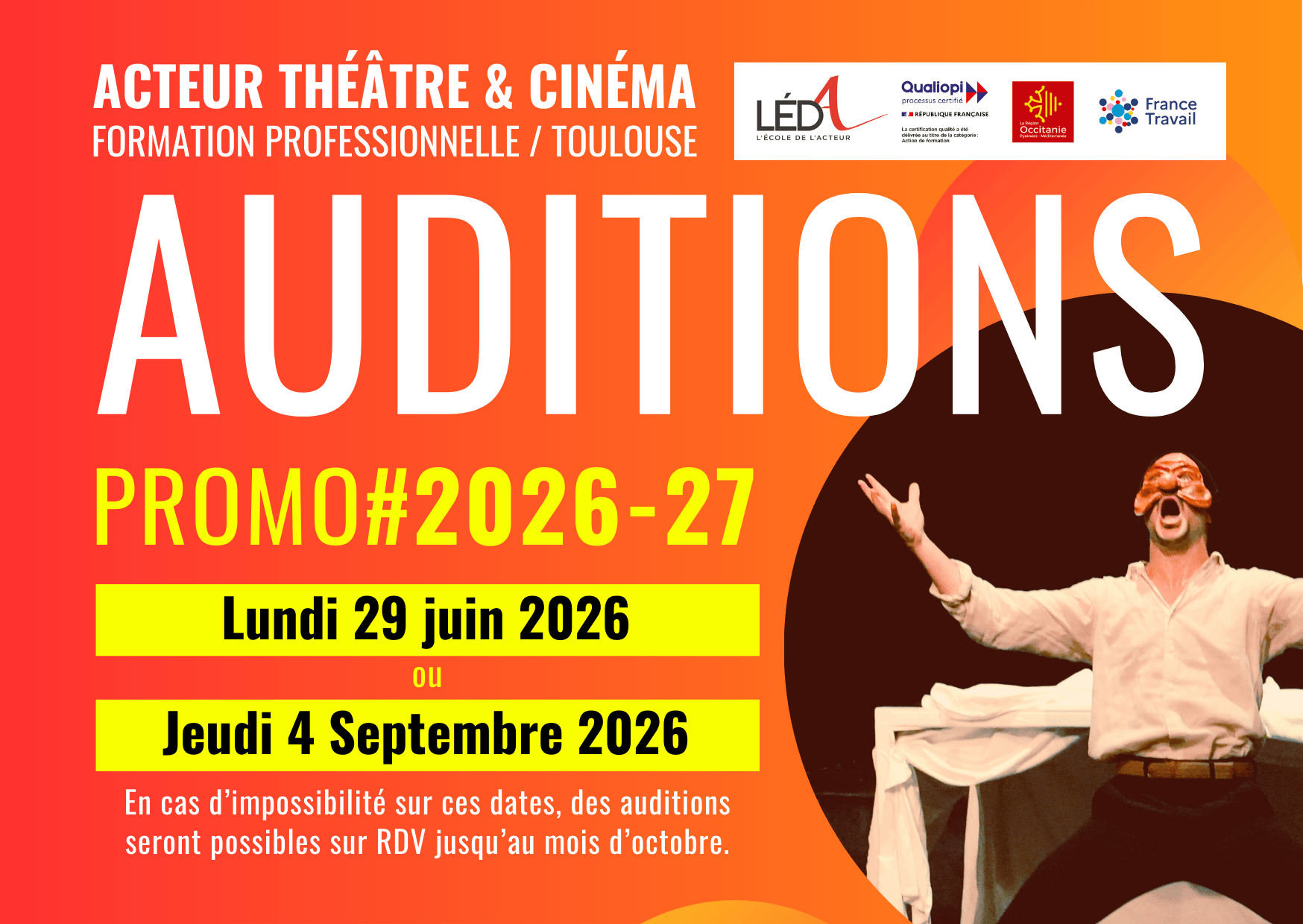 La formation continue de LÉDA est destinée aux comédiens.nes, acteurs.rices débutants ou confirmés, désireux d’apprendre et/ou de perfectionner le métier d’acteur théâtre et cinéma.